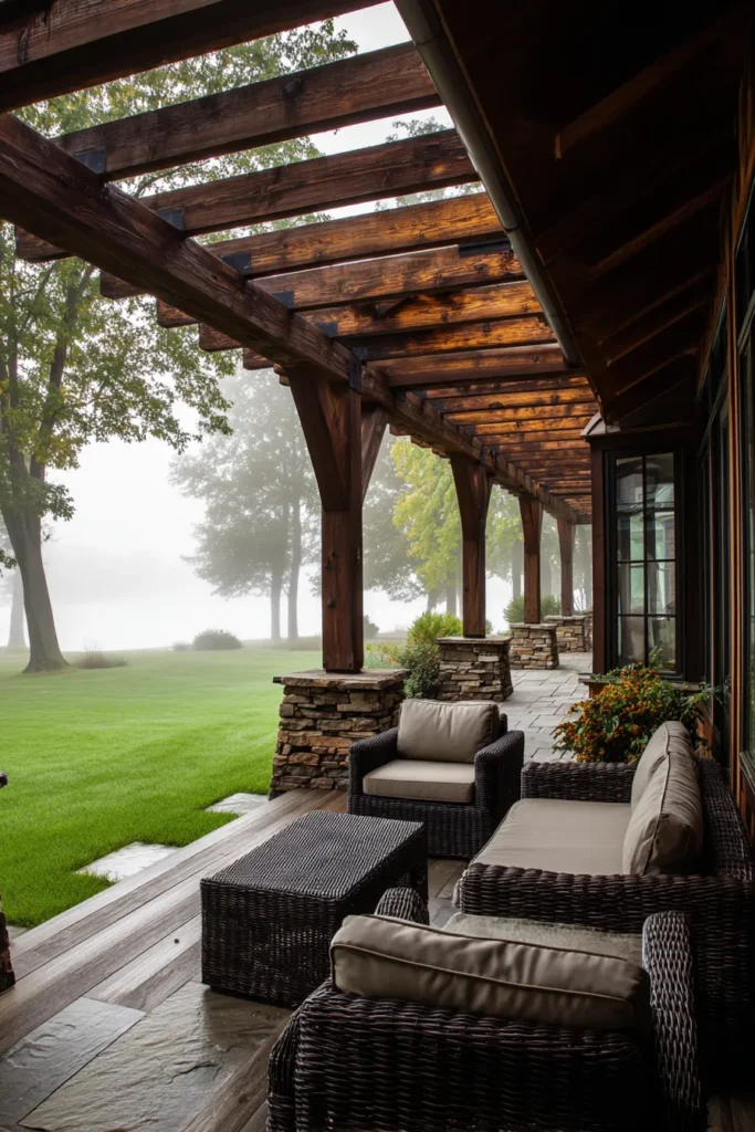 I think this design is just magnificent because it feels so sturdy and luxurious, like a true retreat from the world. I’m completely in love with the combination of the thick, masculine wood beams and the rugged stone work—it’s just such a rich mix of materials. Even on a foggy morning, this porch looks like the ultimate place for coffee and quiet reflection. It really shows how an attached pergola can transform a simple patio into an elegant, year-round outdoor sanctuary.