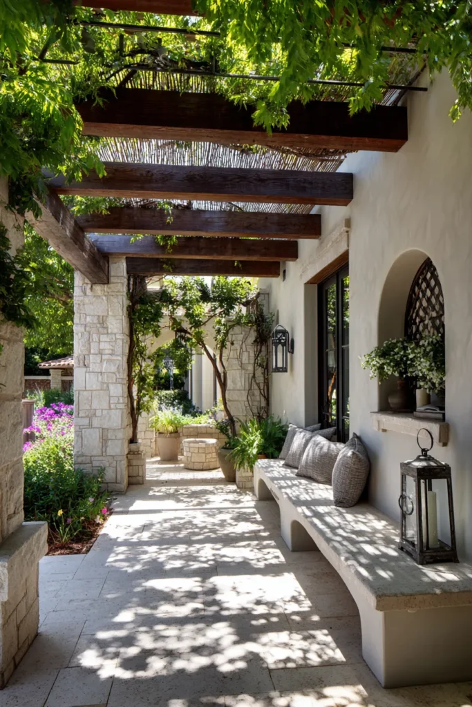 I think this design is just magnificent because it blends structure and nature so flawlessly. I am totally head over heels for the way the sunlight streams through the leaves and the slatted roof, casting those beautiful, dappled shadows on the stone floor—it’s pure magic. The whole look is so serene and romantic, proving that a little bit of beautiful greenery is the absolute best way to make a covered porch feel like a truly special outdoor room.