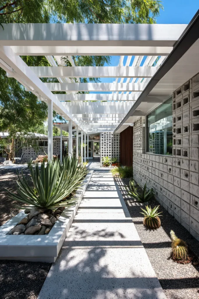 This house is a fantastic example of Mid-Century Modern style, totally chic and effortlessly cool! The exterior features architectural screen block in a geometric pattern, which adds such an amazing texture to the walls. A long, crisp white slat pergola is attached right over the walkway, creating a stunning, shadowed path to the entrance. The landscaping enhances the clean lines, with a simple bed of desert plants like agave and cacti nestled in a sleek white planter. It’s a very structured and visually striking design.