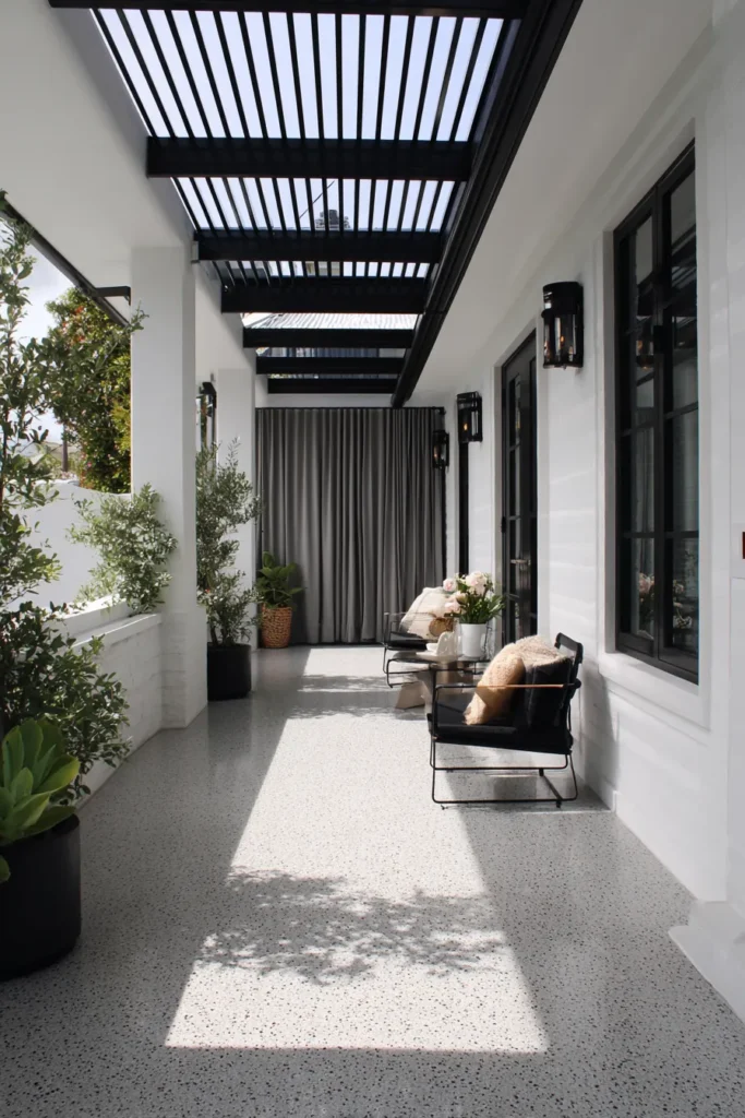 This porch is the height of modern sophistication, featuring a striking black and white color scheme that feels incredibly clean and dramatic. The attached pergola boasts a sleek black louvered roof, which provides adjustable shade and casts sharp, beautiful lines onto the floor. I just love the contrast between the pristine white brick walls and columns and the dark accents. The floor is covered in a lovely light terrazzo or speckled concrete, and the simple, modern seating with fluffy pillows creates an inviting, yet very high-end, outdoor lounge area.