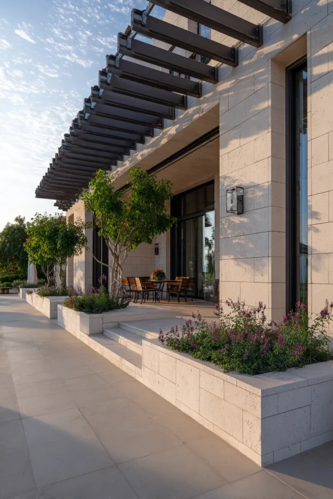 Architectural Perfection with Cream-Colored Stone and a Metal Pergola