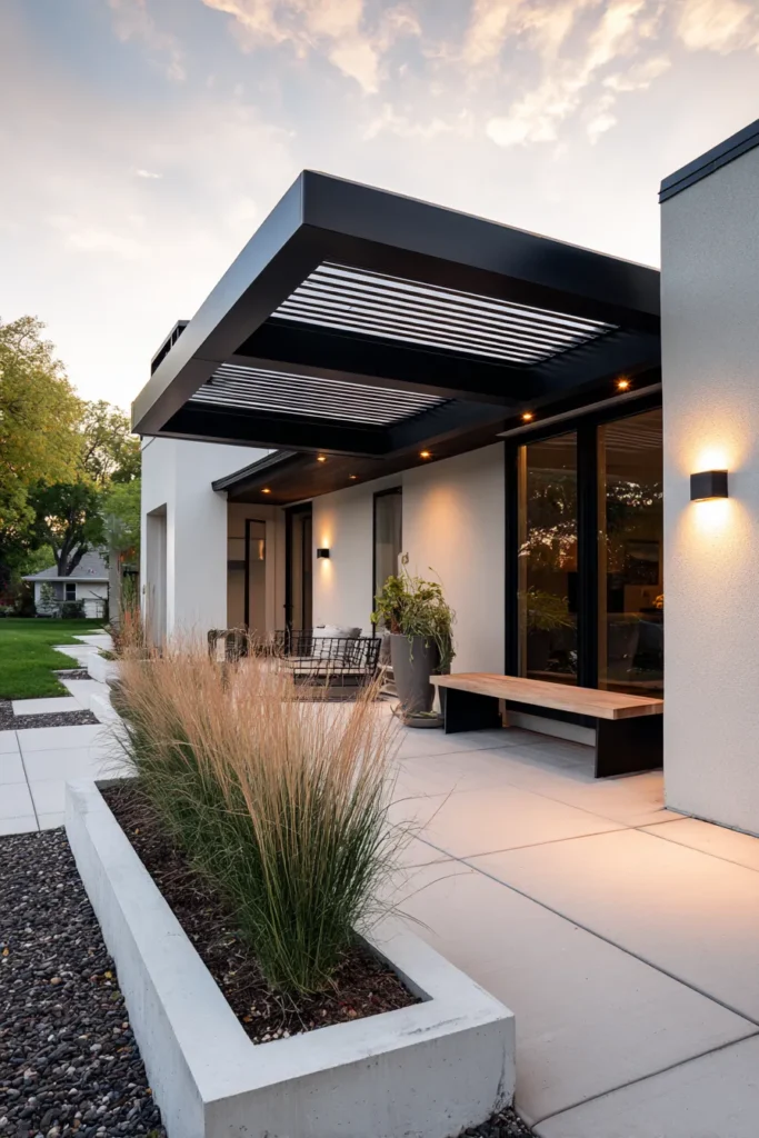 This house is a masterclass in contemporary minimalism with its striking stucco exterior in a soft white or cream color. The porch features an incredibly chic black metal pergola with a louvered roof, creating deep, geometric shadow lines that are a visual treat. I love how the design integrates the landscape with a long, clean concrete planter filled with tall, wispy grasses, adding natural texture against the sharp lines of the architecture. The low-profile wood bench and modern wall lighting complete this very sophisticated, architectural look.