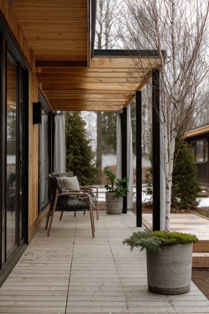 This design is a stunning example of a cozy, modern cabin aesthetic that’s perfect for a woodsy setting. The home’s exterior features beautiful warm wood siding, contrasted sharply by black window frames and pergola columns. The attached pergola provides a lovely covered porch area with a natural wood ceiling and a simple, light wood-planked deck. I just adore how the sheer white curtains are threaded between the posts, adding a soft, romantic touch. Simple concrete planters with birch and mossy ground cover complete this tranquil, nature-inspired space.