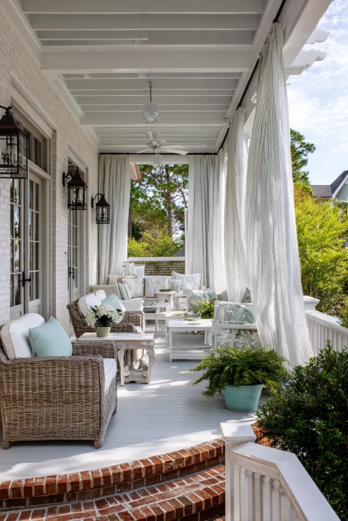 I think this design is just so beautiful because it feels both luxurious and incredibly comfortable. I’m completely smitten with those flowing curtains; they make the porch feel so much more like an indoor room, which is genius for extending your living space. The soft mint green and white color palette is so fresh and serene. It truly looks like the perfect spot to spend a long afternoon sipping iced tea and chatting with friends, which is what great porch design is all about!