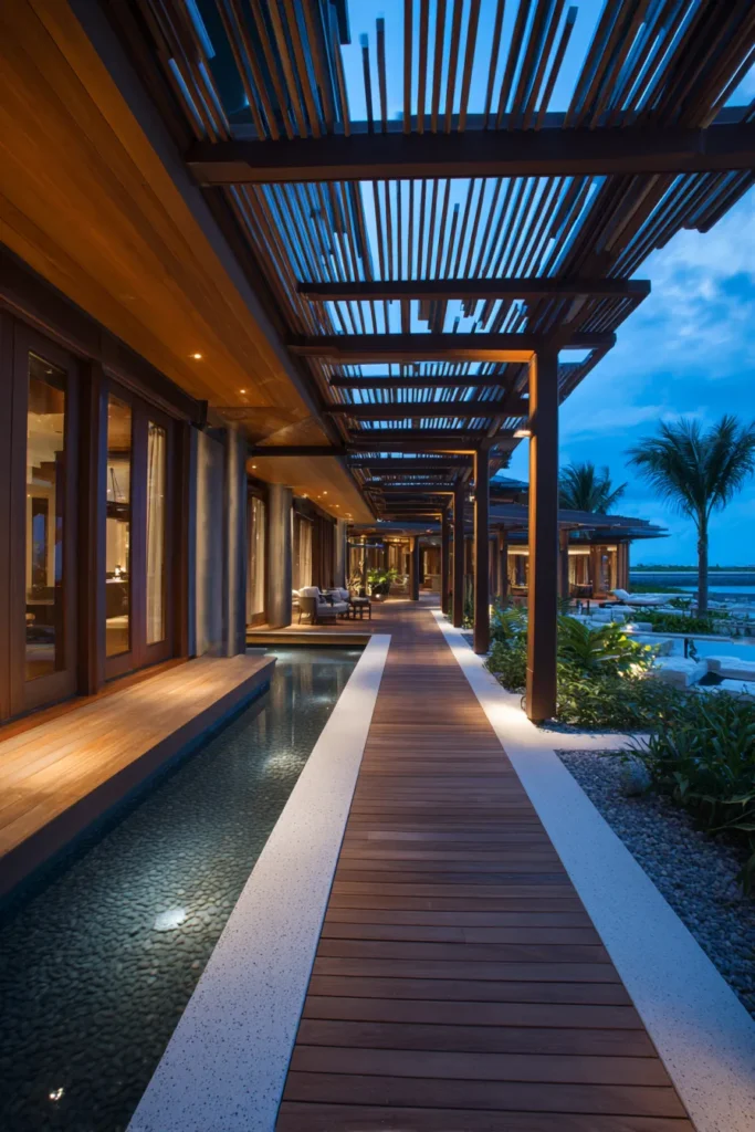 This design is the ultimate in five-star luxury resort style, creating a truly breathtaking outdoor experience. A long, expansive wooden walkway leads past the home, bordered by a gorgeous, narrow reflecting pool that adds a serene, tranquil element. The attached slatted wood pergola runs the entire length of the path, providing dramatic light filtering and extending the beautiful warm wood paneling of the home’s exterior. I love how the design incorporates cozy seating areas right off the main path, inviting you to relax and enjoy the view.