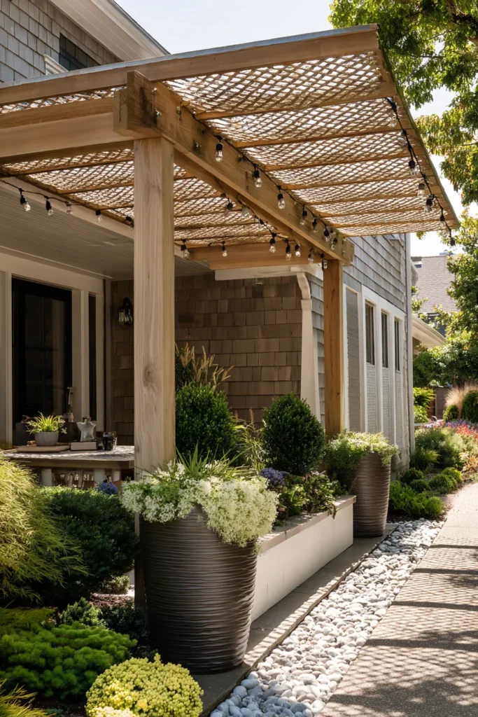 This home perfectly captures that relaxing coastal cottage charm with its warm shingle siding and crisp white trim. The attached natural wood pergola creates a lovely covered porch area that’s just begging for a lazy afternoon. Notice the beautiful landscaping too, with those oversized dark planters filled with lush greenery and a border of smooth white river stones giving the whole space a finished, high-end look. The string lights draped across the pergola roof add a magical touch, making this spot just as inviting at night as it is during the day.