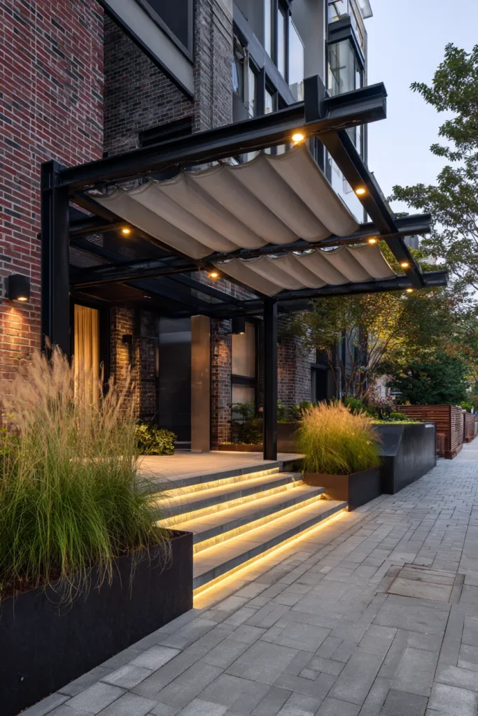 This home is all about urban sophistication and high-tech style! The exterior features beautiful, warm red brick, contrasted brilliantly by the sharp, black metal pergola over the entrance. This pergola is super functional, using a retractable fabric canopy in a neutral taupe color that offers flexible shade and weather protection. What really makes this design stand out are the gorgeous floating stairs with integrated LED strip lighting on each tread—it creates the most dramatic, welcoming glow at night. The landscaping in sleek black planter boxes with tall ornamental grasses is the perfect modern touch.