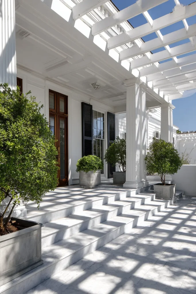 I think this design is just absolutely breathtaking and so incredibly chic. I am completely obsessed with the all-white color palette—it feels so fresh, clean, and totally timeless. The way the sunlight streams through the white pergola slats and casts those sharp, geometric shadows on the marble floor is pure magic. It truly elevates the simple act of walking to the front door into a grand, beautiful experience. This is a brilliant example of how a pergola can amplify the elegance and style of a traditional home!