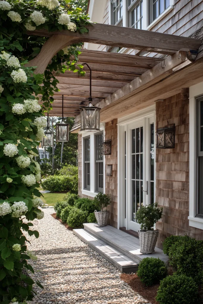 This house design is all about texture and natural materials, giving off the coziest beach house feel. The exterior is clad in gorgeous cedar shake shingles, which have that beautiful, warm, weathered look. A simple yet elegant wood pergola is attached right over the entry, providing both shade and a perfect spot for climbing plants. I adore the French doors and the classic lantern sconces, and the walkway made of small, smooth pebbles adds to that carefree, coastal garden aesthetic. It’s definitely a dreamy look for a seaside retreat.