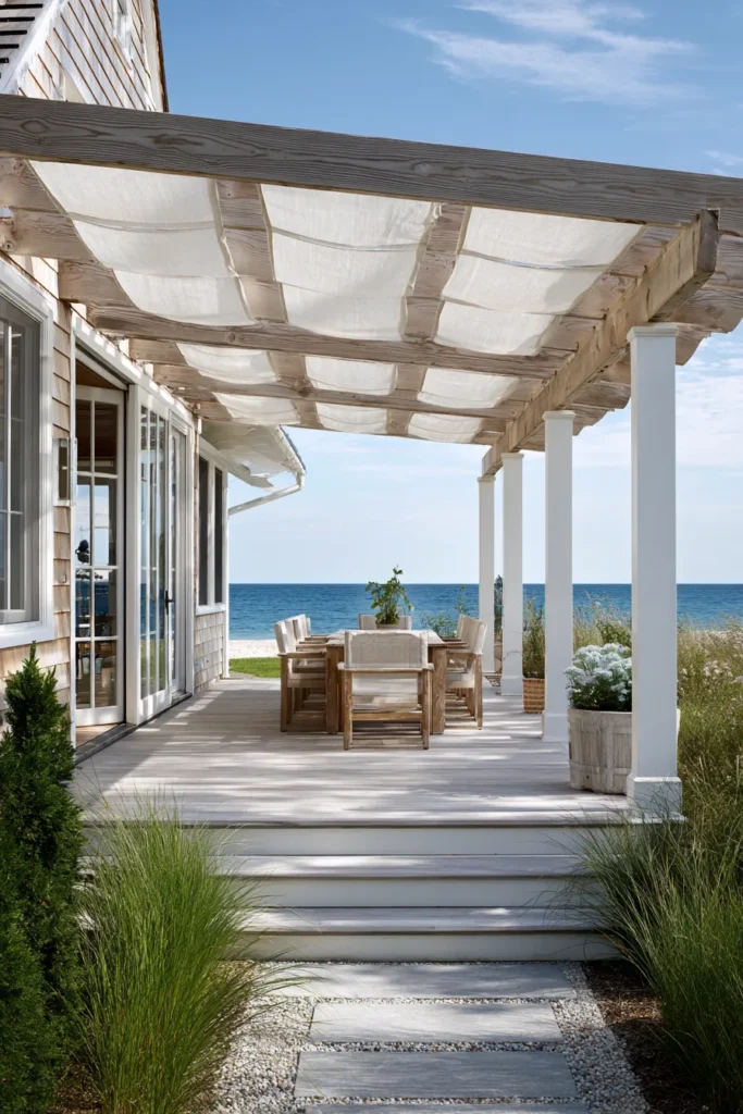 Oh my goodness, this beachfront paradise is absolutely everything! This design features light shingle siding and a gorgeous deck that steps right onto the sand. The attached wooden pergola is painted in a lovely light color and is supported by crisp, classic white columns. What really sets this one apart is the retractable white fabric canopy overhead, which provides adjustable shade and gives the whole area a wonderfully airy, resort-like feel. It’s the perfect spot for an outdoor dining set where you can just soak up that amazing ocean view.