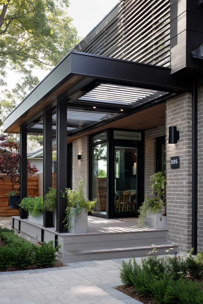 I think this is such an impressive and unique design because it takes the idea of a traditional pergola and makes it incredibly modern. I absolutely adore the dramatic black and wood color palette—it feels very chic and high-end, perfect for a city or suburban lot. This porch doesn’t just provide shade; it truly makes a bold architectural statement right at the front entrance, and that level of style is something I can really appreciate!