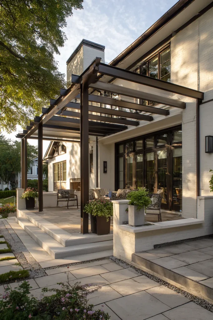 I think this design is just absolutely breathtaking because of its scale and the flawless execution of every detail. I’m completely obsessed with how the light stone creates such a warm yet sophisticated backdrop, and the dark pergola adds that necessary visual punch. The elevated patio surrounded by those manicured flowers truly makes the outdoor space feel like an exclusive European terrace. It’s a gorgeous and unforgettable example of how a pergola can be a major architectural feature.