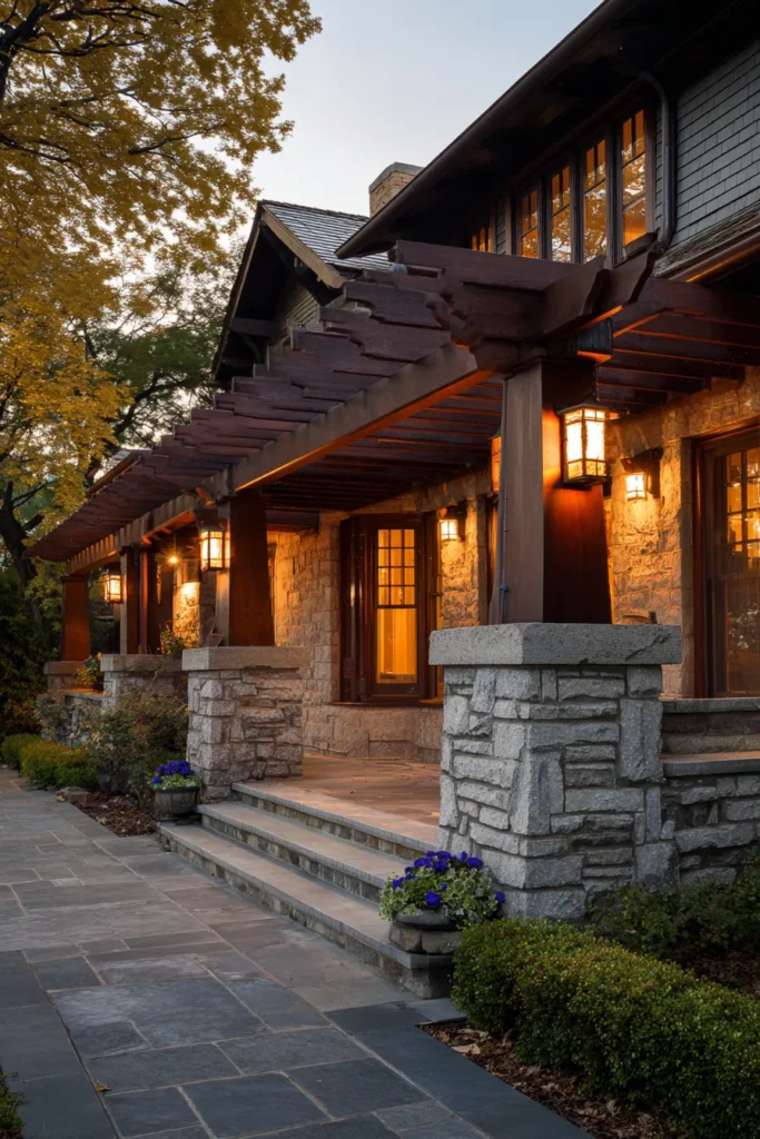 This house is absolutely oozing with classic Craftsman style and charm, especially with those beautiful stone pillars anchoring the long, inviting porch. The exterior combines rustic stone with natural shingle siding on the upper level, creating that perfect blend of textures. A dark, richly stained wood pergola with decorative brackets extends over the porch, offering a sense of enclosure and shade. I adore the row of classic lantern-style sconces that cast a warm, welcoming glow, making this entry feel so cozy, especially as the sun goes down.