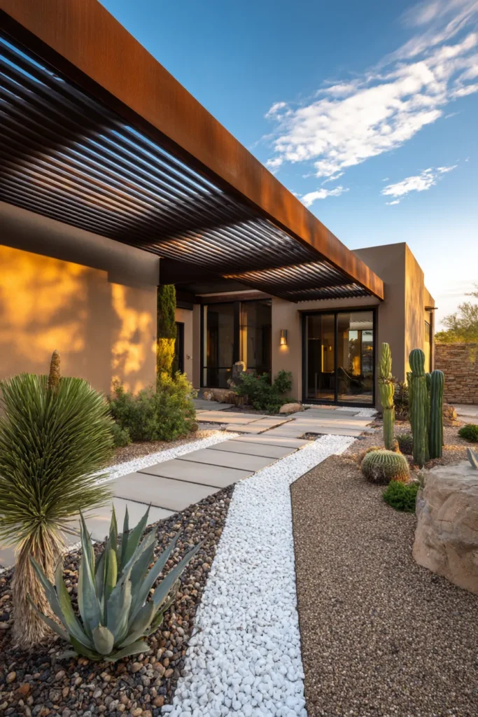 This house is the absolute definition of sleek, sophisticated desert living! It features smooth stucco walls in warm, earthy tones that blend perfectly into the landscape. The attached pergola is a major focal point, with its gorgeous Corten steel fascia and dark louvered roof creating a dramatic line and providing excellent shade over the entry. The landscaping is just as striking, using clean lines of large concrete pavers and a mix of white and earth-toned gravel, all highlighted by beautiful, sculptural desert plants like cacti and agave.