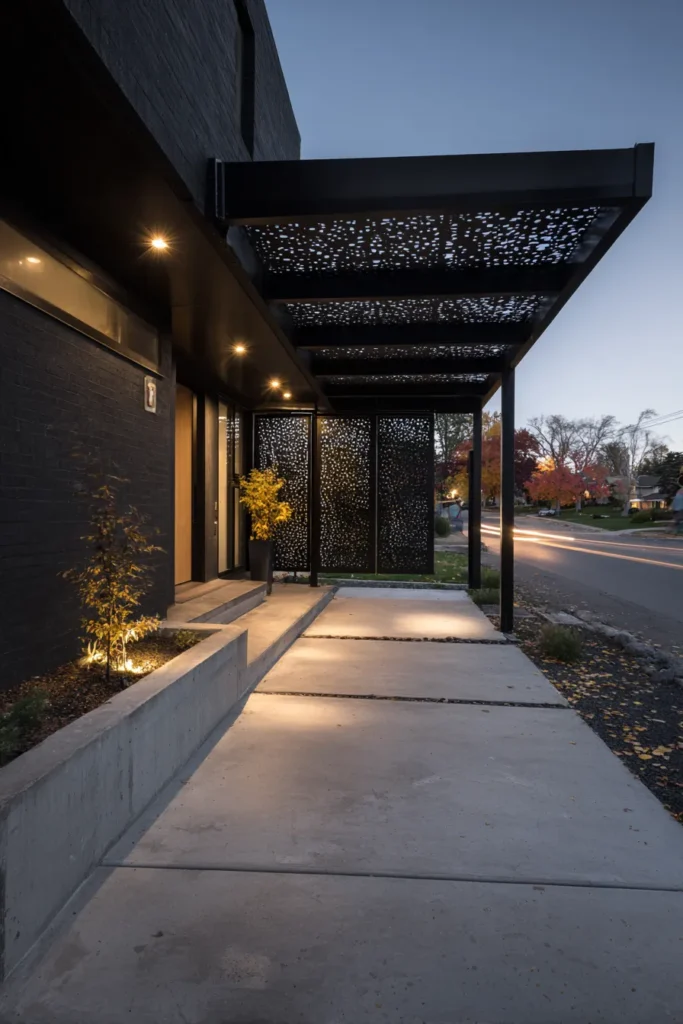 I absolutely think this design is impressive because it’s so unexpected and chic. I’m completely obsessed with that decorative pergola roof—it’s not just for shade; it casts the most gorgeous, dappled shadows, especially when the accent lights are on. It turns a simple entrance into a gallery-worthy display. The combination of the dark, textured brick and the clean lines of the concrete is just flawless, proving that sometimes the darkest color palette can create the brightest, most inspiring design!