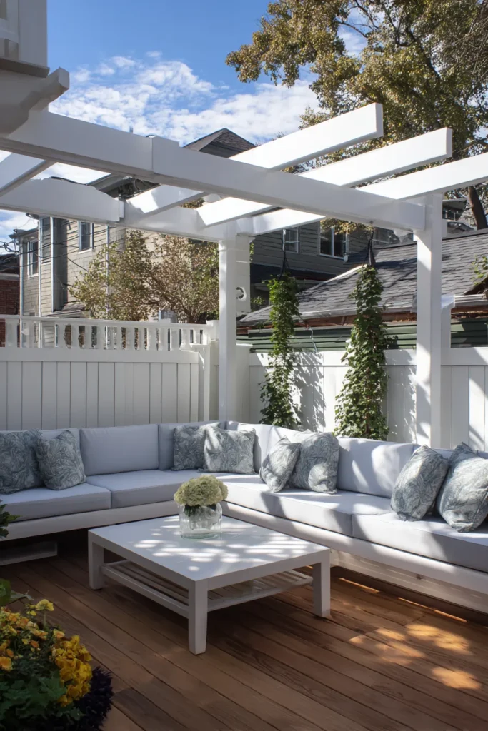 This stunning pergola design creates a true outdoor living room right in a compact urban backyard. It features a bright white painted wood structure that perfectly matches the high privacy fence surrounding the space, instantly making the area feel bigger and more cohesive. Beneath the pergola is a beautiful L-shaped sectional with light gray cushions and chic patterned pillows, all sitting on warm wooden decking that grounds the entire design. The combination of the white wood and the natural tones of the floor and plants is just chef’s kiss.