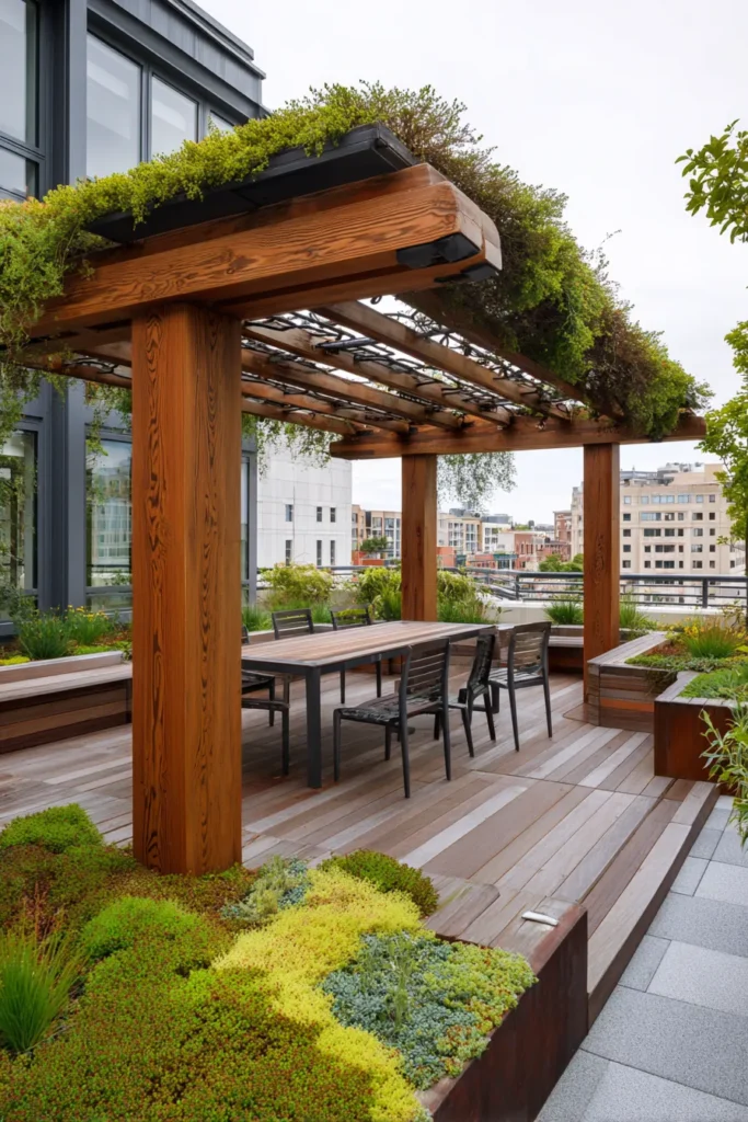 This incredible design transforms a small city rooftop into a lush, functional dining and lounge area. The pergola is built from gorgeous, richly stained wood with thick, substantial posts that give the structure a powerful, modern presence. Its crowning glory is the innovative living green roof, which is overflowing with cascading greenery, creating the most amazing natural canopy. Below, a chic dining table with modern black chairs is perfectly framed by the structure, surrounded by elevated wooden decking and integrated garden beds filled with beautiful mosses and plants.