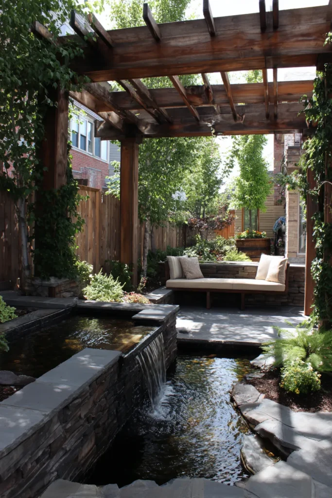 I honestly love how this pergola design creates a dedicated relaxation zone that feels so removed from the outside world. It maximizes the space by giving you shade and structure right next to the therapeutic sounds of running water, which is just brilliant for turning a small area into a sensory experience. The combination of the warm wood, the cool stone, and all that greenery is simply perfect. It’s truly a beautiful, high-impact design that gives you a feeling of luxury and tranquility right in your own compact backyard.