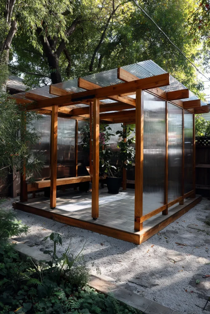 This clever structure shows how to create a completely sheltered, dedicated room in a small backyard. It’s built with warm natural wood beams and posts but features translucent corrugated panels on both the roof and the sides, giving it the feel of a bright, airy greenhouse or sunroom. This enclosure sits on a lovely raised wooden platform, turning a gravel area into a protected sanctuary perfect for sensitive plants or a cozy reading nook. The combination of the warm wood and the filtered light is just so inviting and creates beautiful, soft shadows.