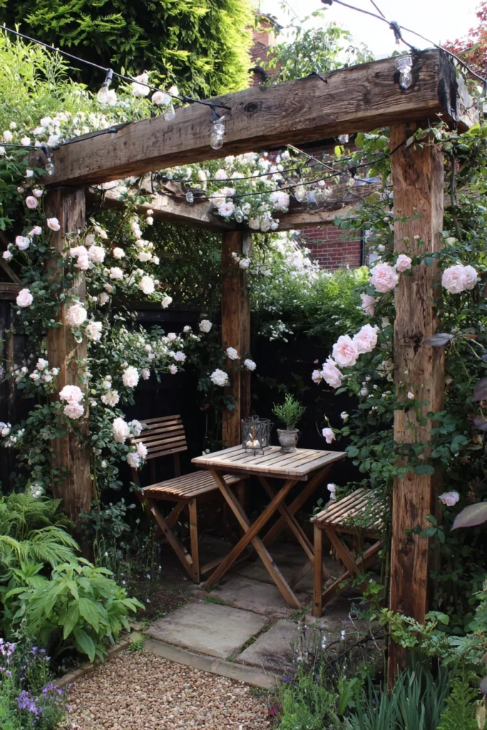 I truly adore how much beauty and function this pergola squeezes into such a small spot. It maximizes use by creating a dedicated dining or chat area that feels incredibly private and secluded, even in a small garden setting. The combination of the dark, textured wood and the overflowing, delicate pink roses is simply breathtaking. It’s an easy design to recreate for anyone wanting that dreamy, magical garden moment for their morning tea or a sweet evening date night, and I think it’s just the sweetest thing ever.