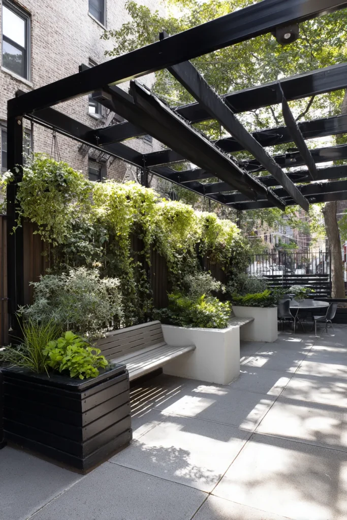 This bold and modern pergola design creates a structured, shaded lounge area right on a small city patio. The structure uses sleek black metal beams that provide a strong, contemporary look, with some of the roof slats painted black for adjustable shade. The real key to maximizing this small space is the clever use of vertical greenery. A low wooden privacy screen serves as a backdrop for cascading vines and plants, complemented by long, low white planter boxes with integrated bench seating, and deep black planters. The concrete patio floor keeps the look clean and urban.
