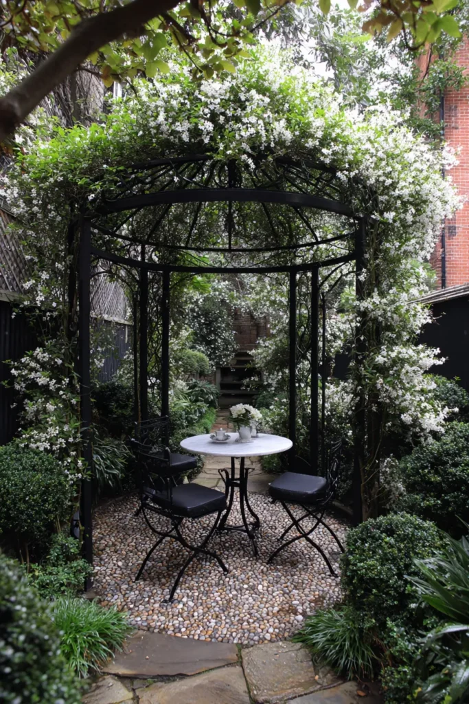 This absolutely stunning design proves you can create a huge impact in a tiny space by focusing on structure and greenery. The pergola here takes the form of a delicate black wrought iron gazebo, giving it a beautiful, vintage, and feminine silhouette. It’s completely covered with fragrant white climbing jasmine or star-like flowers, creating a lush, private canopy and walls. Beneath the canopy, a tiny white marble bistro table and two chic black chairs sit on a patch of light-colored pebbles, perfectly defined by the surrounding clipped hedges and greenery.