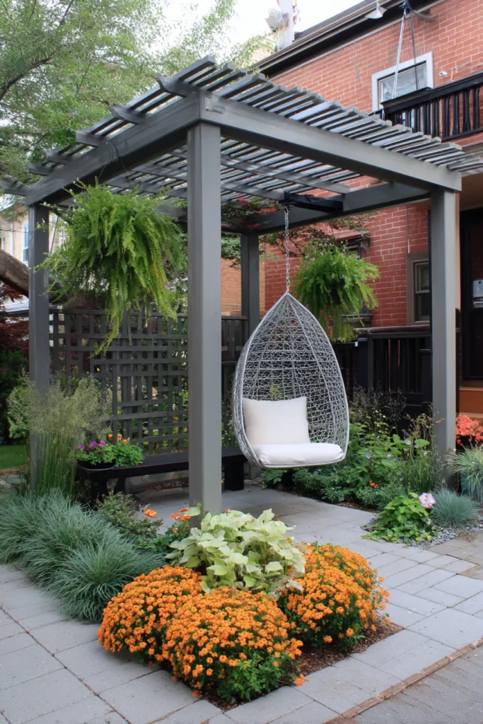 This super chic design creates a dedicated relaxation zone in a small backyard, focusing all the attention on a single, delightful feature. The pergola is built with modern, dark gray painted wood which gives it a strong, contemporary feel that contrasts beautifully with the red brick house. It perfectly frames a trendy woven egg-shaped hanging chair with a plush white cushion, creating the ultimate private reading nook. The area is softened by lush, low-maintenance plantings and bright orange mums that bring a wonderful pop of color to the neutral hardscaping.