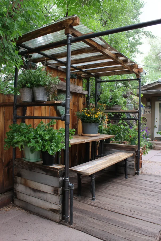 This incredibly resourceful pergola shows how to turn a small patio corner into a multi-functional gardening and seating area. The structure is brilliantly built using black industrial pipes for the frame, giving it a unique, edgy feel, complemented by natural wood beams and a clear corrugated roof for shelter. It fully maximizes the vertical space with built-in shelving for potted herbs and flowers, along with a long wooden bench for sitting or working. The whole thing sits cozily against a warm wooden privacy fence, turning a simple deck area into a charming workspace.