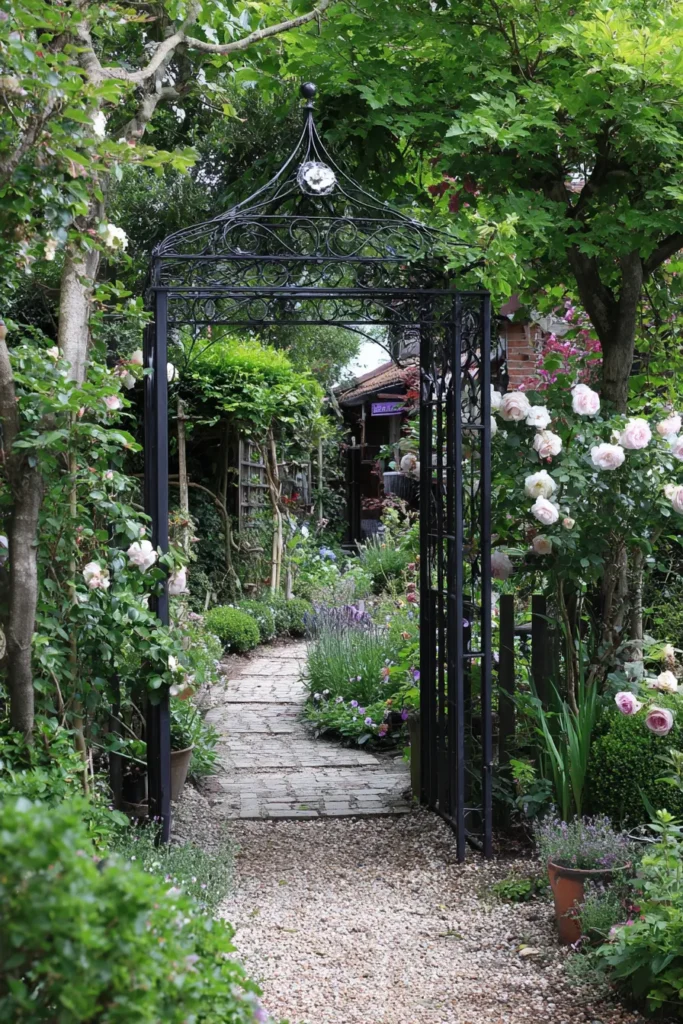 I truly adore how this archway maximizes the use of a narrow passage by turning it into a beautiful, memorable moment. It uses height and structure to make the garden feel deeper and more mysterious, giving you that lovely sense of arrival when you walk through the gate. The way the arch is softened by all the overflowing flowers is just magical, and the whole scene makes me want to put on a flowy dress and go explore. It’s a perfect, romantic idea for anyone wanting to add a little bit of fairytale whimsy to their compact garden!