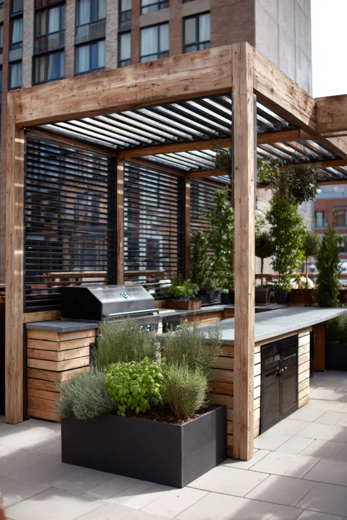 This incredible design transforms a small patio into a fully functional outdoor kitchen with tons of style. The robust pergola is built from beautiful, thick natural or reclaimed wood timbers, which give it a warm, rustic-modern feel against the backdrop of the city buildings. It shelters a sleek cooking area featuring a built-in grill, tons of counter space with gray tops, and storage tucked away below with stylish slatted wood paneling. Dark louvered screens provide fantastic privacy and a wonderful backdrop for all the gorgeous greenery in black planters, making this feel like a truly special retreat.