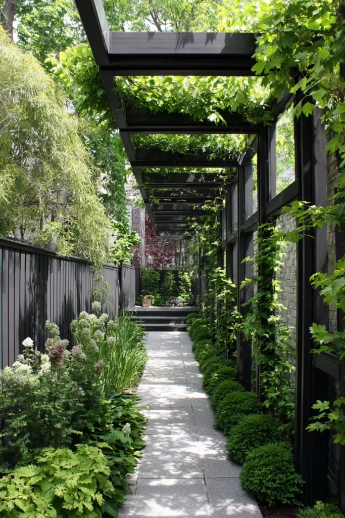 This sophisticated design uses a series of connected pergola structures to transform a narrow side yard into a stunning, canopied walkway. The frames are built with sleek black wood or metal, which provides a striking, modern contrast to the vibrant greens of the climbing vines and surrounding plants. The structure’s strong lines lead the eye down the path of light gray paving stones toward a distant, mysterious end, making the space feel incredibly deep and purposeful. Lush climbing ivy and Boston ivy are perfectly trained to weave over the top and down the side screens, creating dappled shade and beautiful texture.