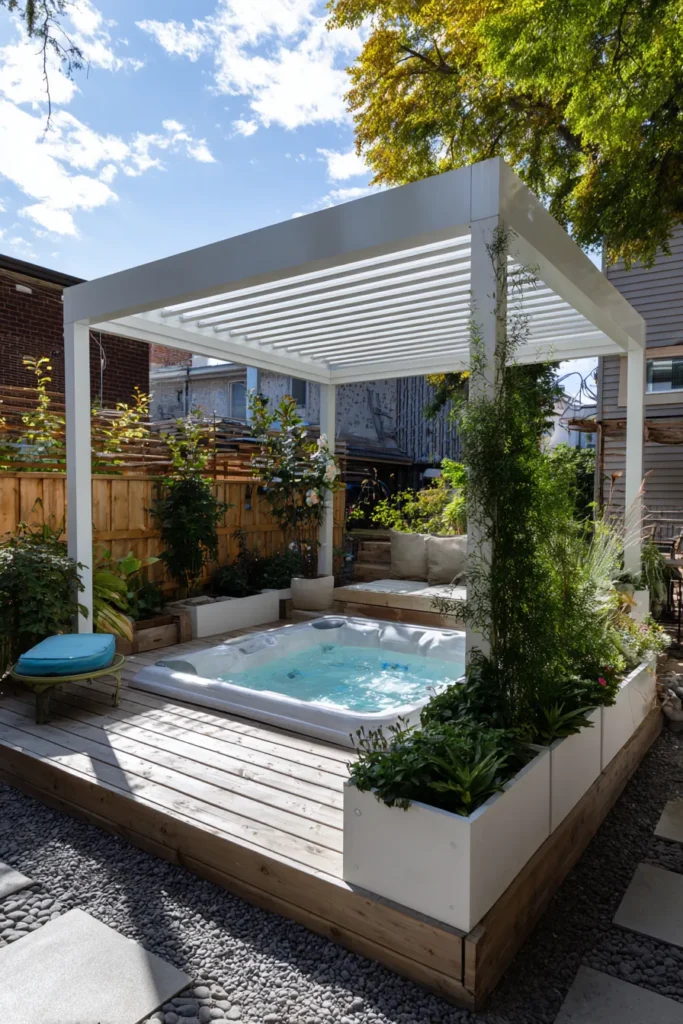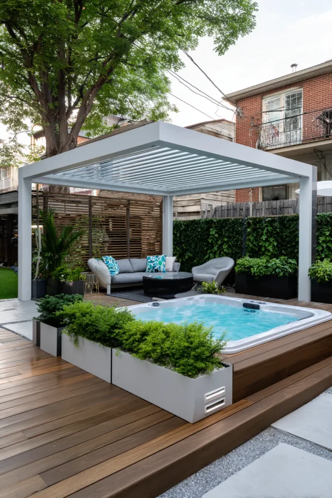 This incredible pergola creates a private, resort-style escape that maximizes every inch of a compact urban backyard. The structure is a sleek white metal with an adjustable louvered roof, which offers flexible sun and rain protection over a full outdoor living space. The design brilliantly incorporates a built-in hot tub right into the warm wooden decking, framed by chic white planters overflowing with greenery. The area under the pergola is defined by comfortable gray outdoor furniture, with a slatted wooden screen providing elegant privacy from the neighboring property.