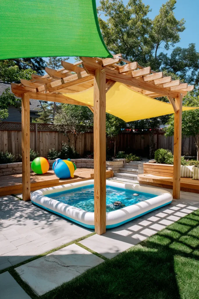 I absolutely adore how bright and playful this design is, and how smartly it uses the pergola to provide essential sun protection over the water. It’s such a clever way to maximize use in a small yard because it clearly defines a spot for water play, keeping the rest of the yard available for grass and other activities. Plus, the combination of the warm wood, the cool gray patio stones, and those pops of sunny color from the shade sails makes the whole space feel so inviting and energetic. It’s truly a genius, family-friendly design