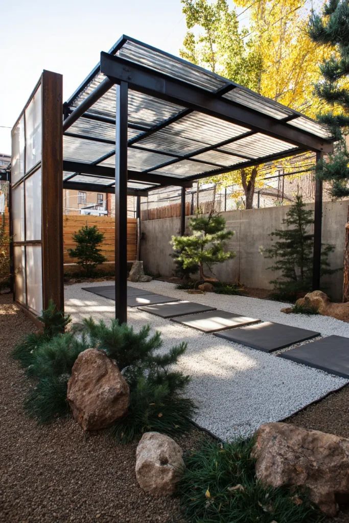 This striking design brings modern, industrial style to a small yard, creating a beautifully structured yet peaceful outdoor retreat. The pergola is built with sleek black metal framing and features a genius transparent, corrugated roof that lets in all the lovely sunshine while keeping out the rain. The space below is arranged in a minimalist Zen garden style with a light-colored gravel path and large, dark gray pavers leading the eye through the yard. It’s flanked by a unique frosted panel wall with weathered metal accents on one side, adding a fantastic layer of texture and privacy.