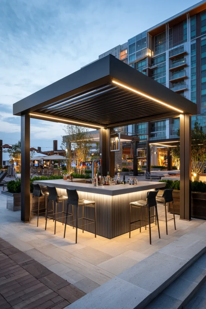 This incredible pergola design turns a small outdoor space into the ultimate spot for entertaining with a fully stocked outdoor bar. The structure itself is a stunning, sleek black metal with a louvered roof that provides flexible shade and shelter, giving it a super modern look. The real magic happens with the lighting; integrated LED strips trace the edges of the roof and provide beautiful under-bar lighting, creating the most amazing, sophisticated glow for evening gatherings. It perfectly frames a gorgeous bar with seating for four, all sitting atop light, neutral stone pavers that contrast beautifully with the dark frame.