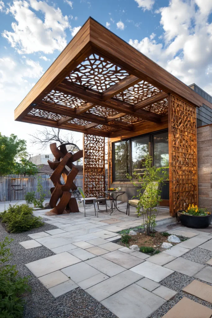 This phenomenal pergola design is an absolute showstopper, bringing high-end architectural detail to a cozy backyard patio. The entire structure is crafted from beautiful richly toned wood, but the real magic is the intricate geometric pattern carved into the roof panels and the stunning side privacy screen. This laser-cut design casts gorgeous, dappled shadows onto the light-colored patio pavers and dark gravel below, creating a truly dynamic and artistic space. It extends outward from the house, beautifully framing a small bistro set, making it the perfect spot for intimate conversations.