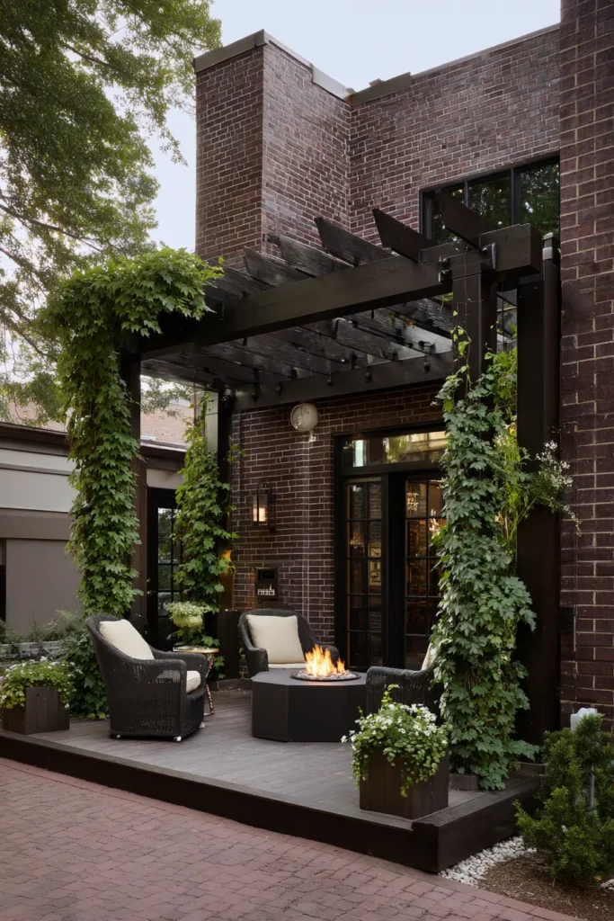 This elegant pergola creates the most perfect, intimate fireside lounge on a small deck adjacent to a brick home. The structure is built from a dark-stained or painted wood, which offers a beautiful contrast against the building and provides a rich, grounded feeling. What truly brings this design to life are the lush green vines that are beautifully trained to climb the support posts, weaving nature right into the architecture. Four comfortable wicker armchairs circle a modern fire pit, turning this small outdoor area into a year-round destination for relaxation.