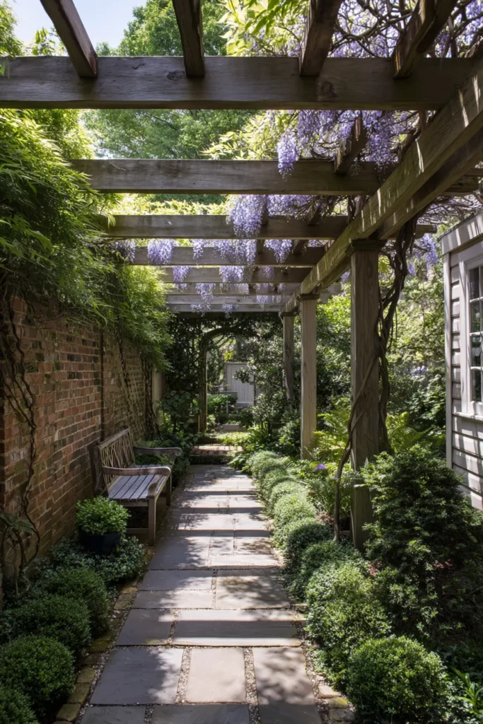 This enchanting design uses a simple, weathered wood pergola to transform a narrow side yard into a spectacular, inviting garden walkway. The structure’s beams and posts are generously draped with flowering vines, including gorgeous purple wisteria, which creates a breathtaking, scented canopy and casts romantic dappled shadows across the stone pathway. A charming built-in wooden bench sits against the classic brick wall, offering a perfect moment for pause and reflection. Lush green hedges and climbing plants line the path, making this small, overlooked space feel incredibly deep and lush.
