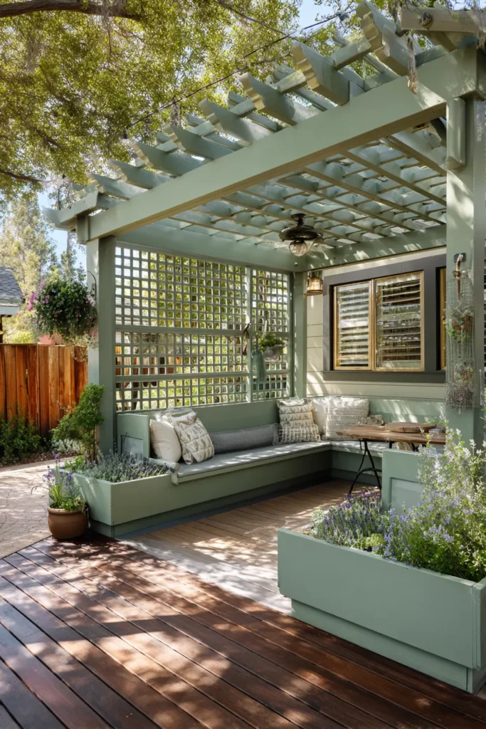 Charming Sage Green Pergola with Built-in Seating