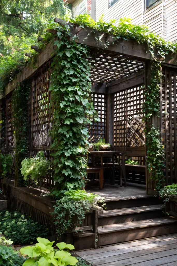 This design features a wooden pergola with lattice sides, wrapped in climbing vines that create a leafy cocoon. Inside, a simple wooden dining table makes it perfect for shaded meals.