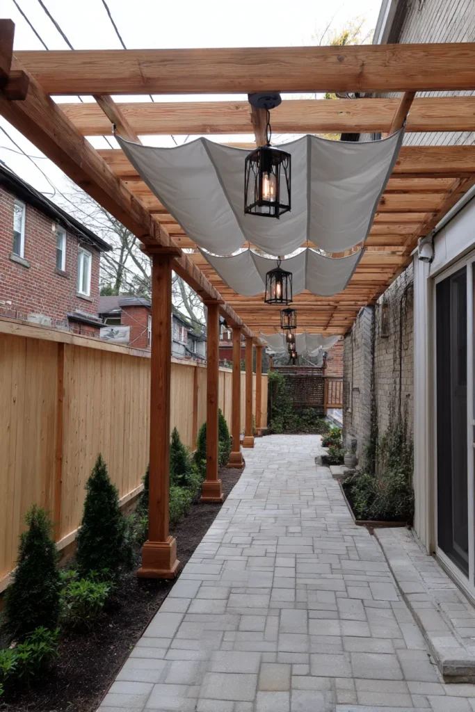 This pergola lines a long walkway with lantern-style lights hanging between fabric panels. The flowing canopy softens the wooden beams and adds shade while keeping things airy.