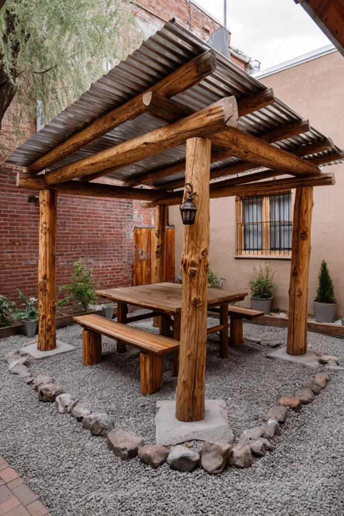 This pergola is made with sturdy log beams and a corrugated roof, sitting over a gravel base with a picnic table beneath. It has a rugged, handmade look that’s simple but practical.