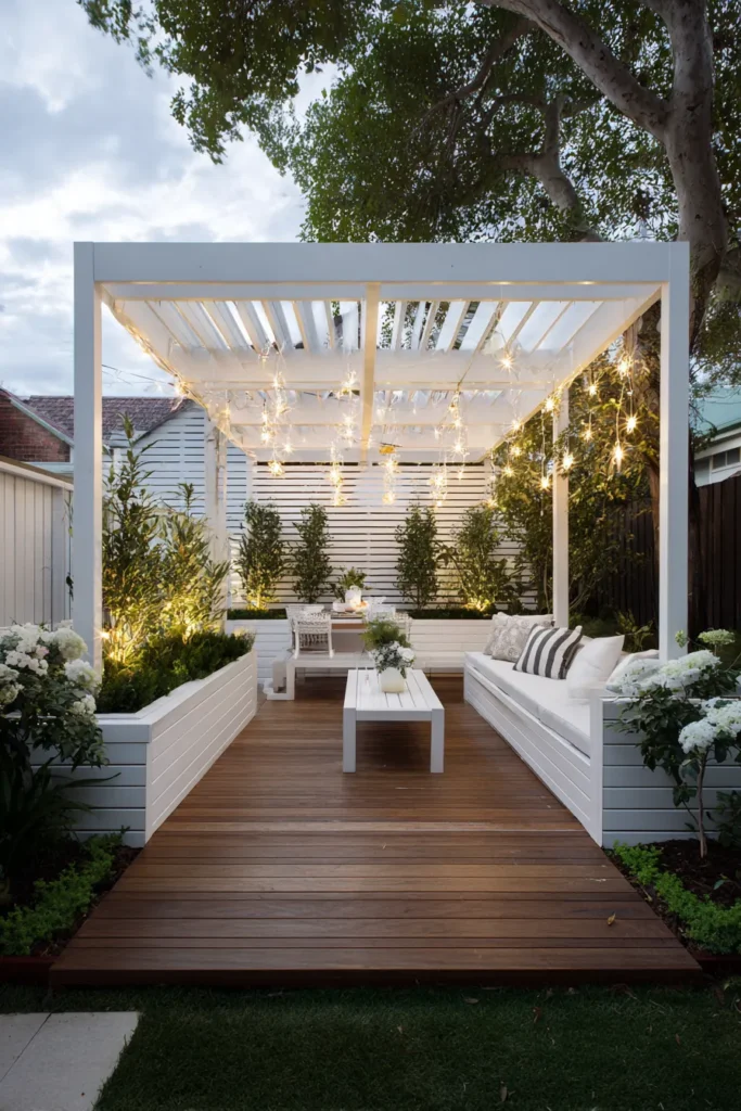 This pergola shines with clean white lines, cozy built-in seating, and a wooden deck that adds warmth. Twinkling string lights drape overhead, making it the perfect blend of modern design and romantic glow.