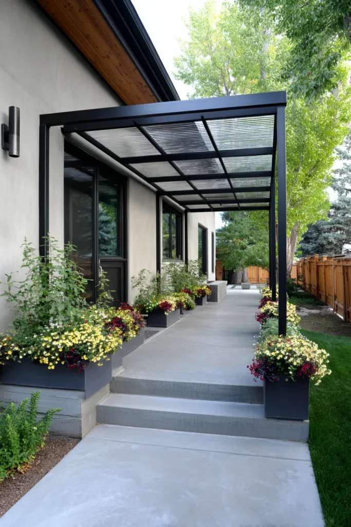 This slim pergola uses a black frame with a transparent roof, shading the walkway along the house. Neat planters filled with colorful flowers soften the modern look and bring life to the space.