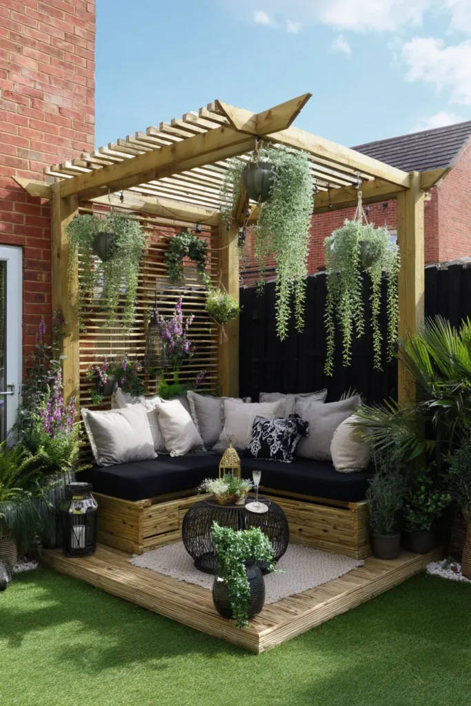 I love how calming this looks. It proves that even a small pergola can feel like a luxurious getaway when paired with natural materials and lush greenery.