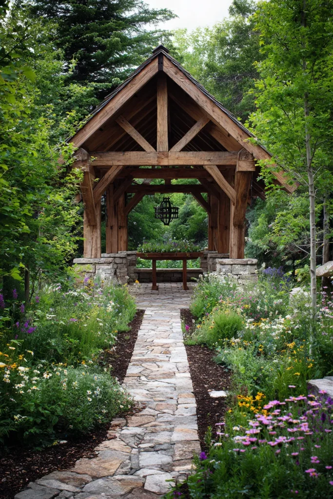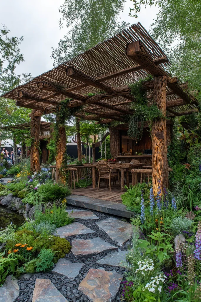 This pergola is crafted from branches and woven wood, giving it a wonderfully earthy, handmade feel. Surrounded by lush flowers and set on a stone path, it looks like it belongs in a woodland retreat.
