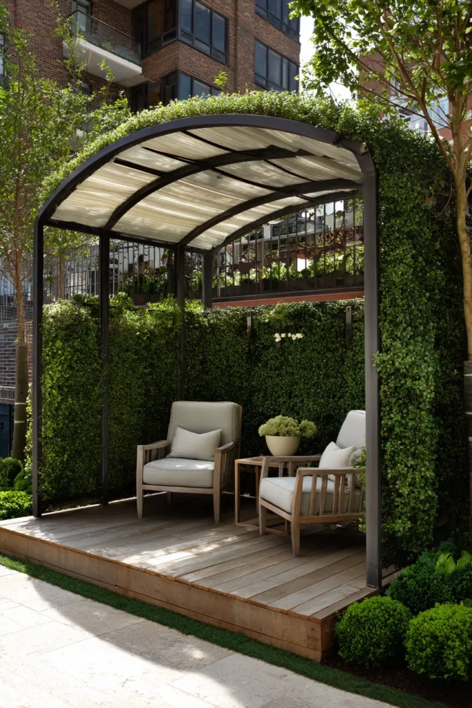 This pergola has a modern curved roof paired with a lush green wall backdrop. A raised wooden platform holds two armchairs, creating a quiet little lounge area.
