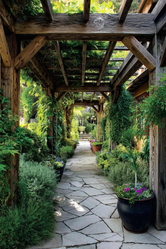 This pergola features sturdy wooden beams draped in climbing vines, creating a natural tunnel effect that leads you through the garden. The stone pathway underneath feels charmingly uneven, lined with planters and greenery that make the whole space feel lush and alive.