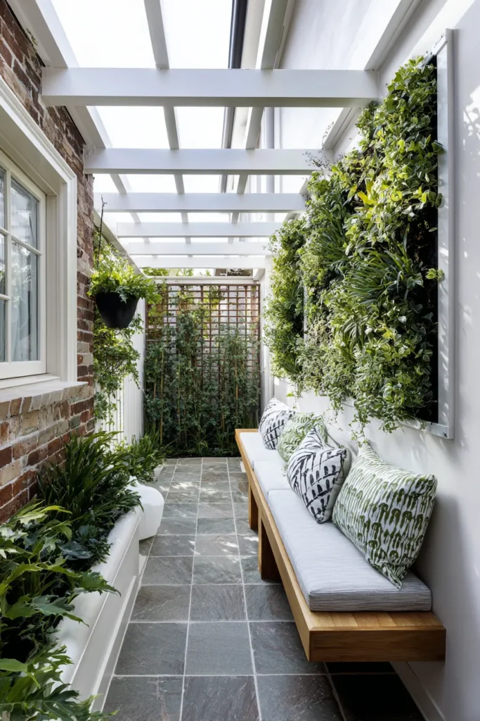 This pergola lines a slim passageway with a simple white frame. A built-in bench sits opposite a wall of vertical greenery, while pops of patterned pillows add a playful touch.