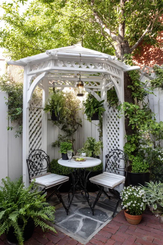 This small white pergola is styled like a little outdoor room, with lattice sides and hanging greenery that wrap around a quaint bistro table. The crisp white structure brightens the corner while plants in every shade of green soften the look.